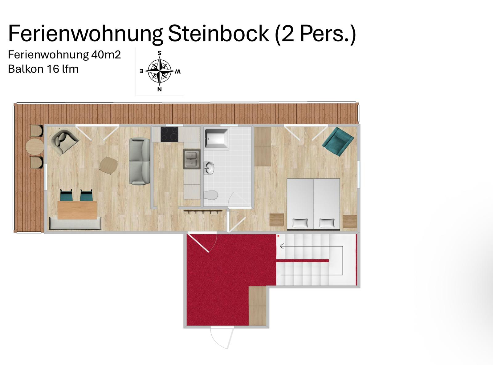 Appartment Fuchs, Met de optie van een extra slaapkamer en badkamer op de gang, kan dit appartement tot 3-4 personen ontvangen. Het balkon op het zuiden en de ‘eigen’ tuin met zitjes bieden een fijne plek om te genieten van de zon en de omgeving. De extra slaapkamer heeft een balkon op het westen, waar je kunt genieten van de middagzon en het uitzicht op het bos.